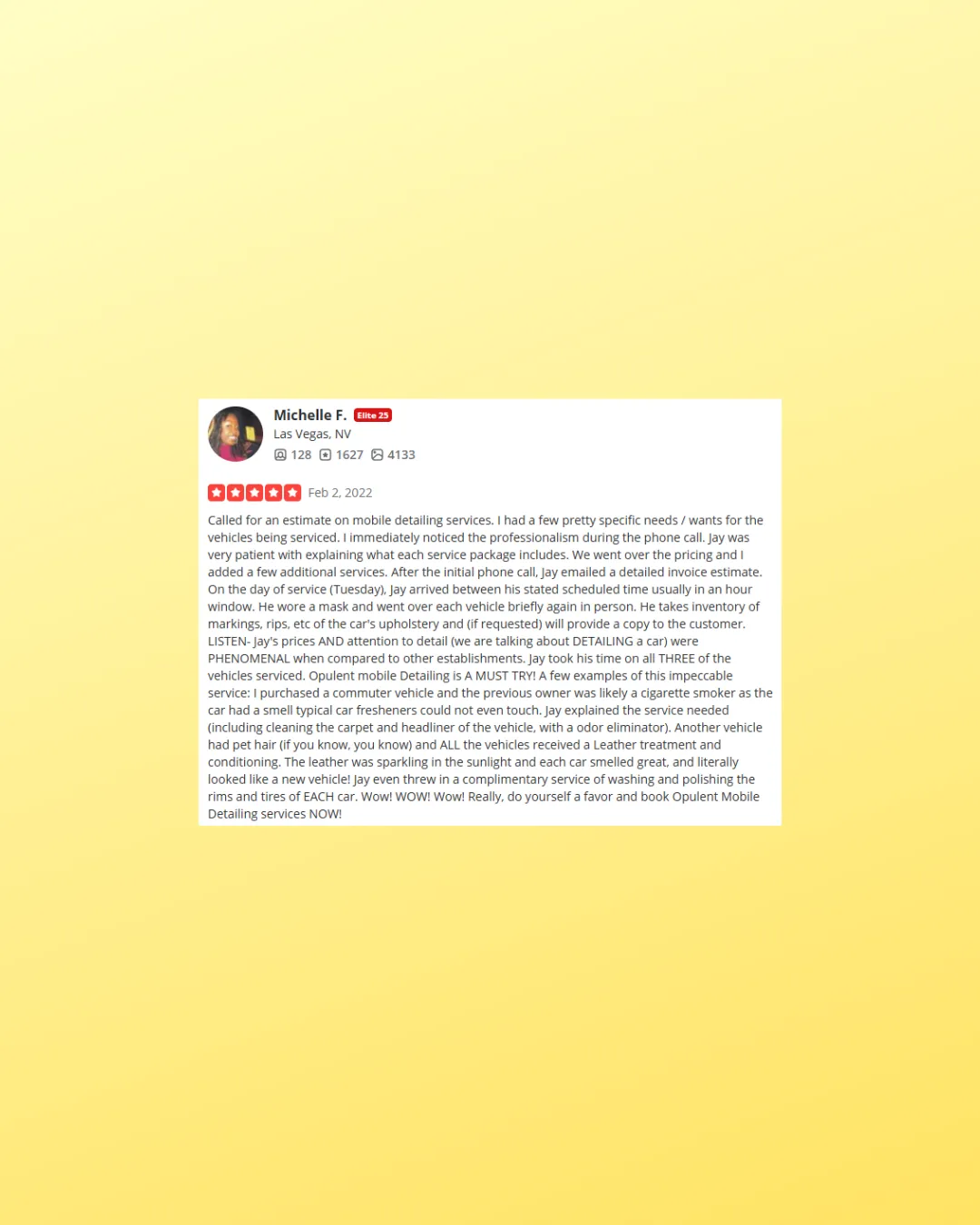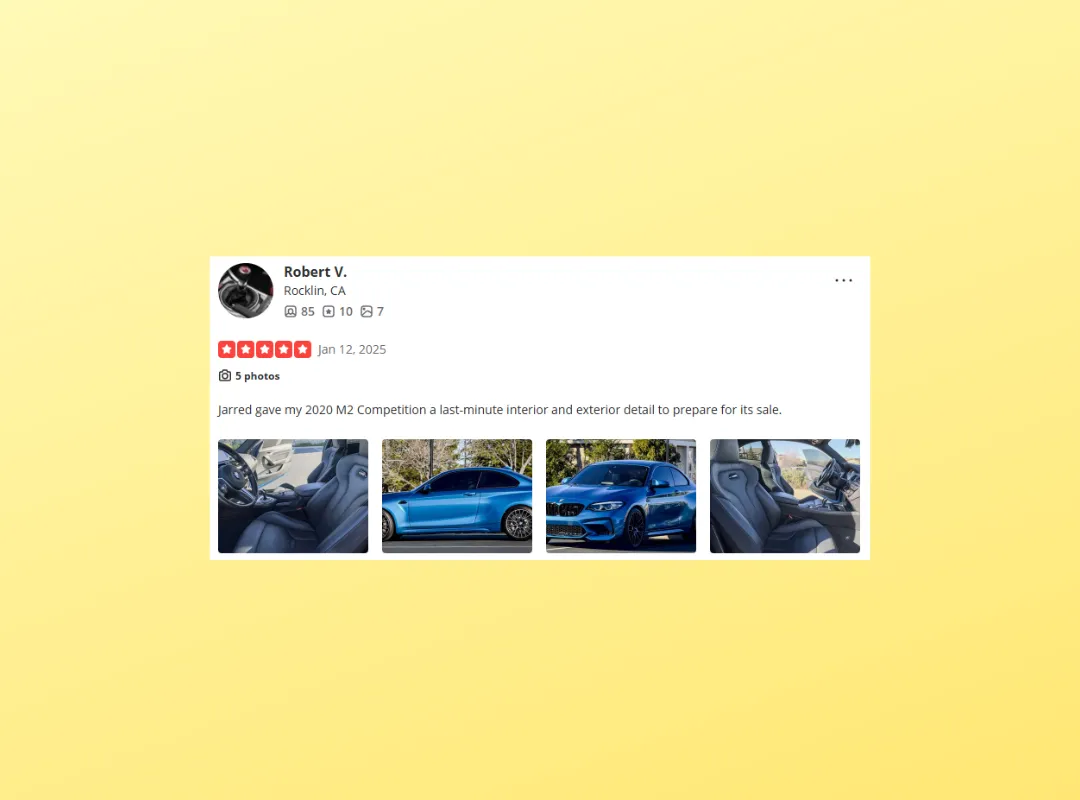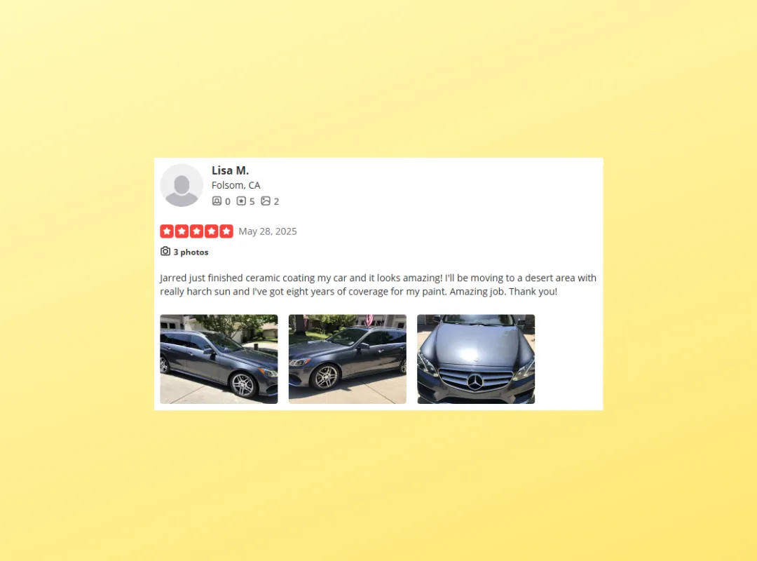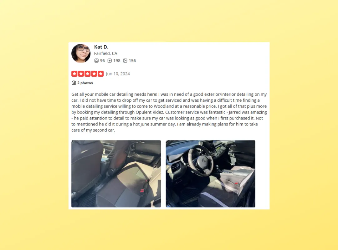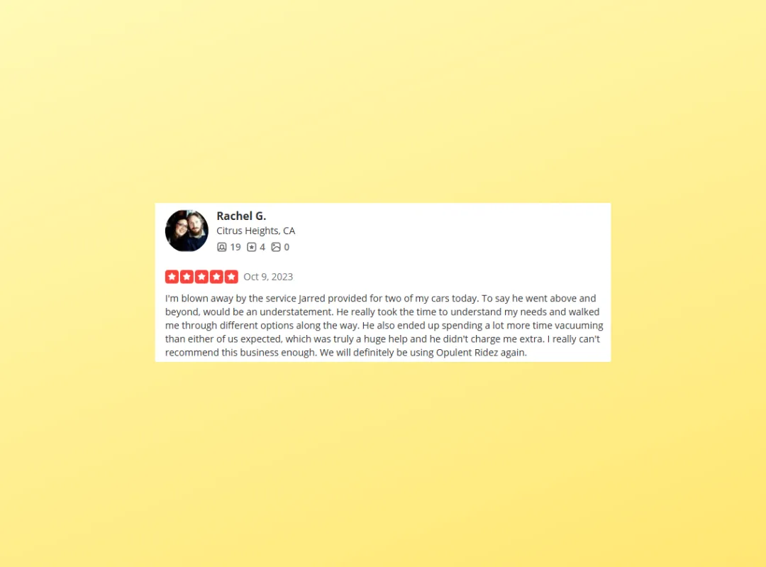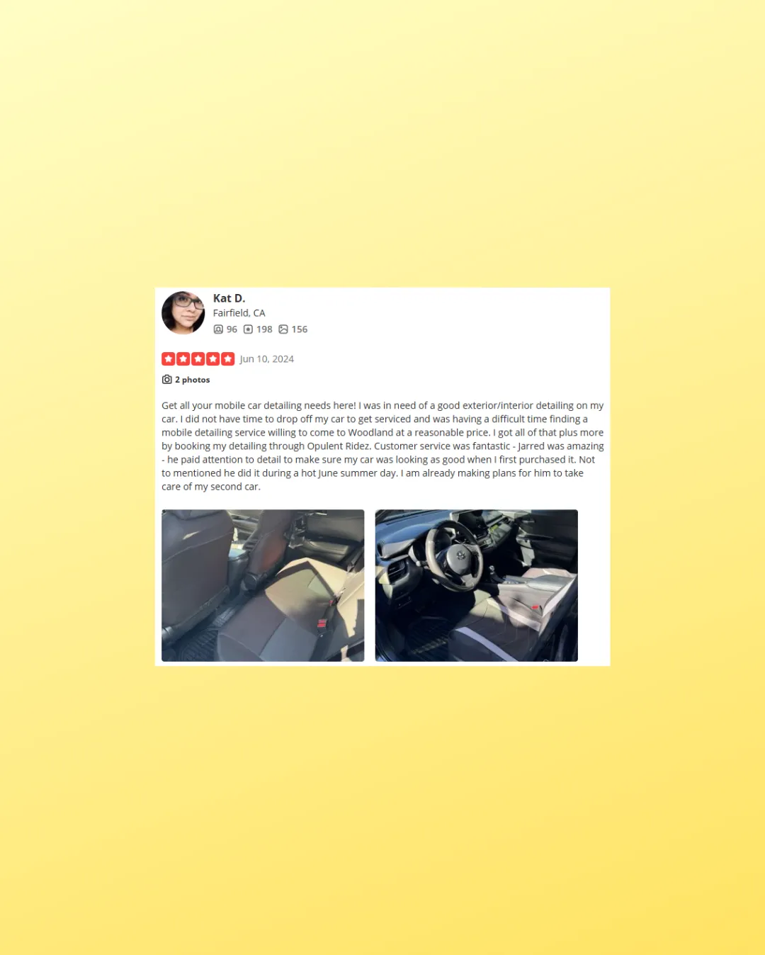 When it comes to auto detailing or ceramic coatings, your neighbors in Elk Grove all agree that Opulent Ridez is the way to go! Top notch customer service meets professional auto detailing results - delivered conveniently at your doorstep! Give us a call today and see for yourself how Opulent Ridez stands head and shoulders above the competition!